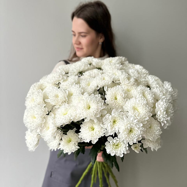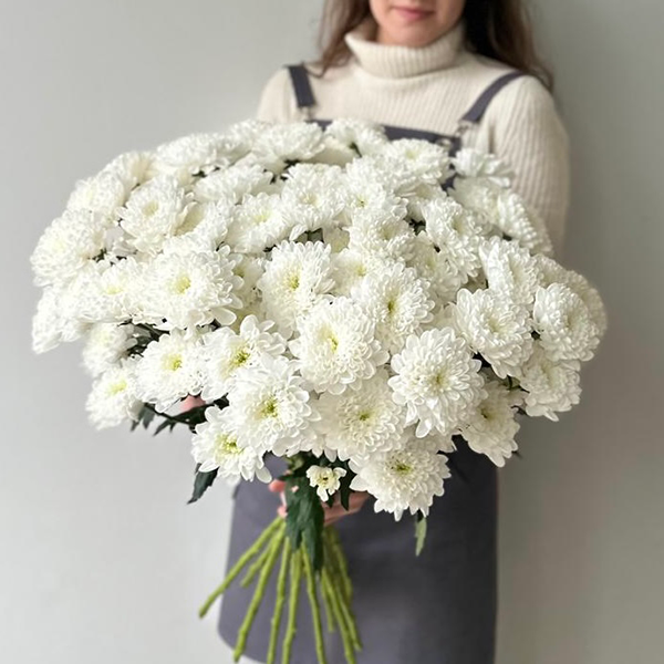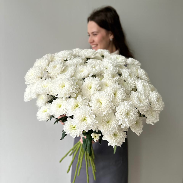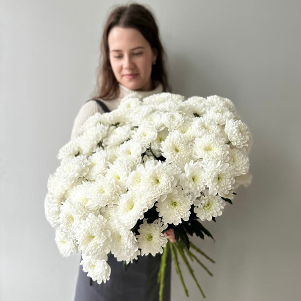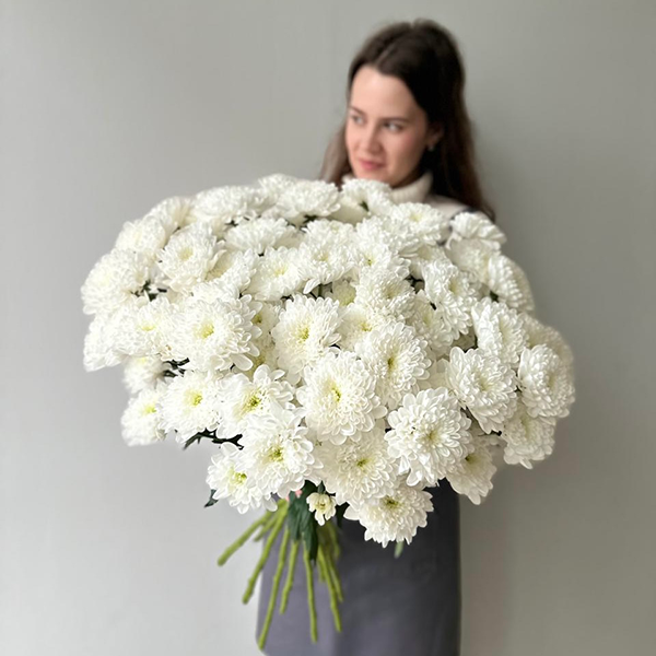По Вашему желанию букет может быть выполнен в другой цветовой гамме, пожалуйста, уточняйте у администратора цвет хризантем, имеющихся в наличии.