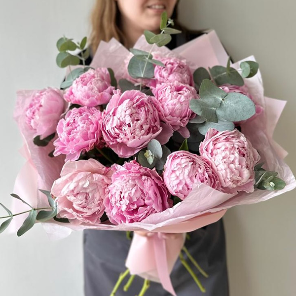 Букет из розовых пионов c эвкалиптом в упаковке от 5680