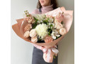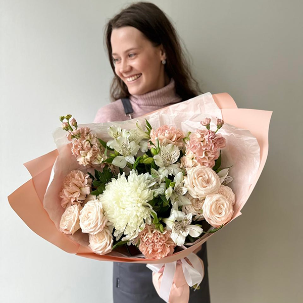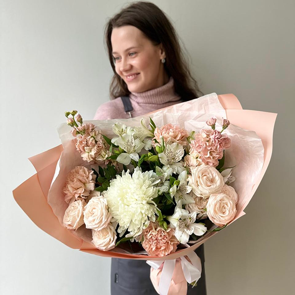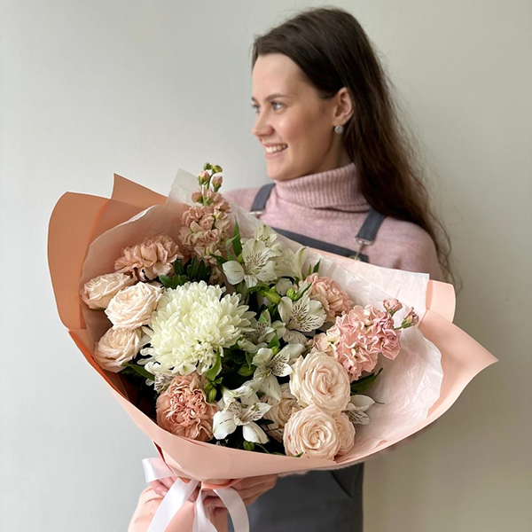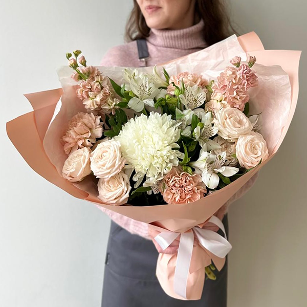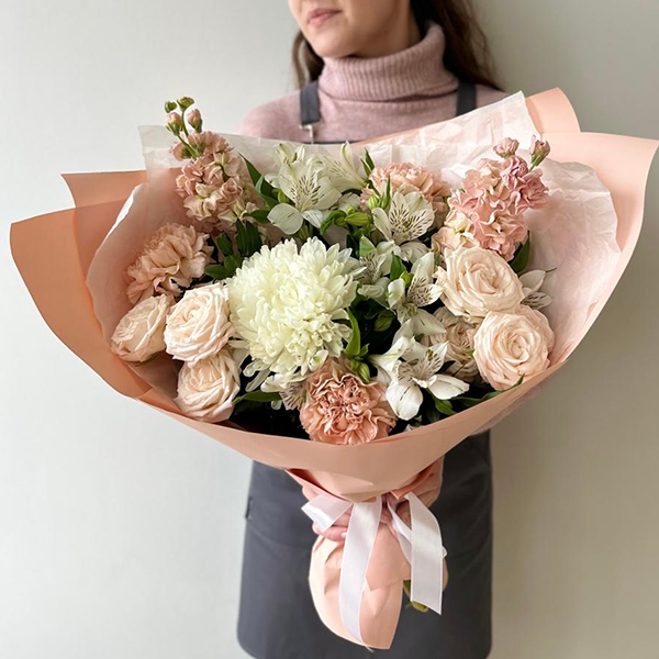 Хризантема одноголовая, роза пионовидная кустовая, диантус, маттиола, альстромерия, упаковка, лента атласная