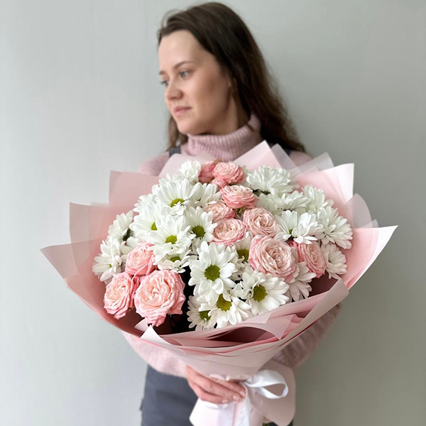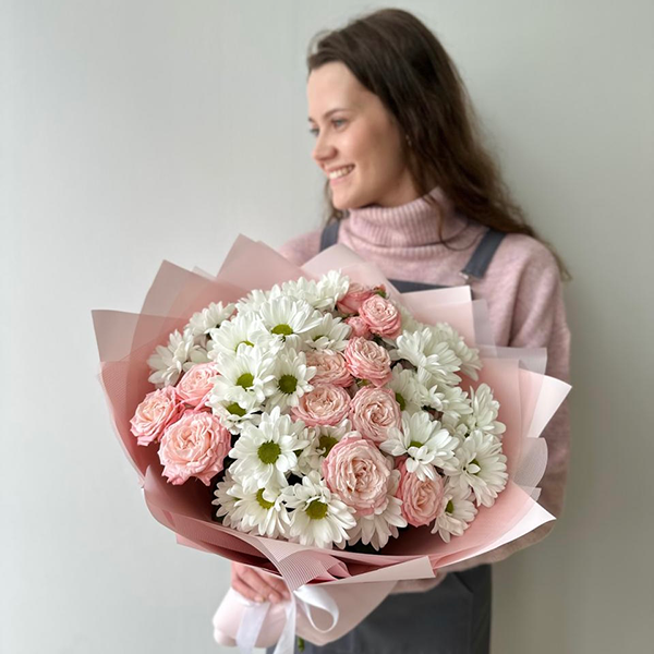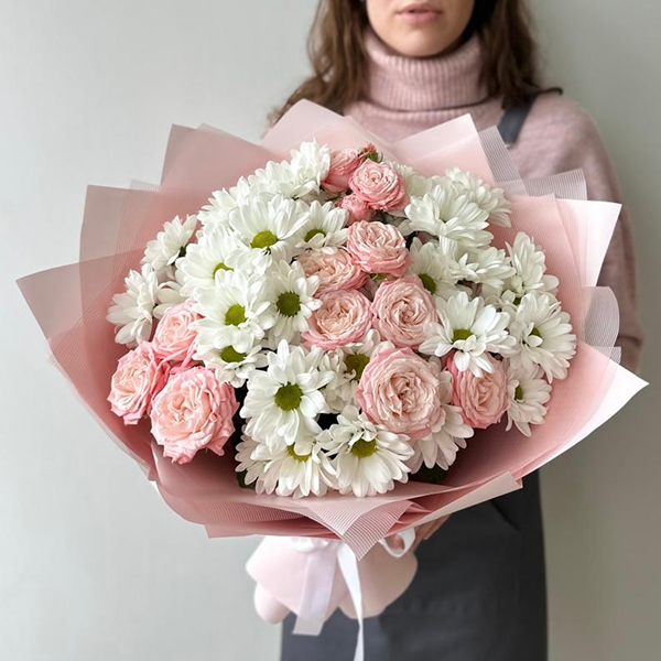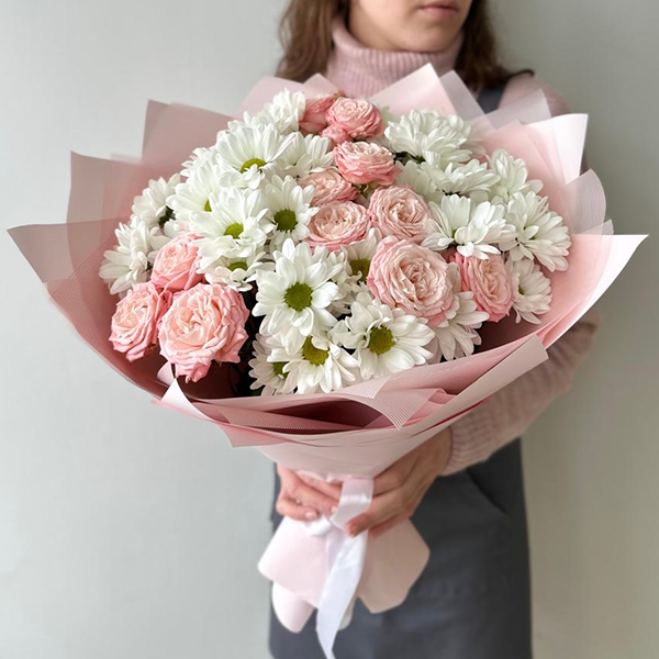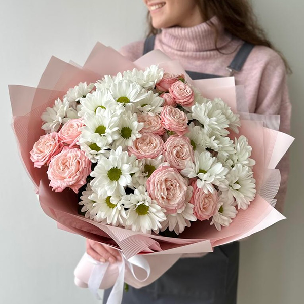 Букет из нежной кустовой пионовидной розы и хризантемы-ромашки "Дженни" от 4550