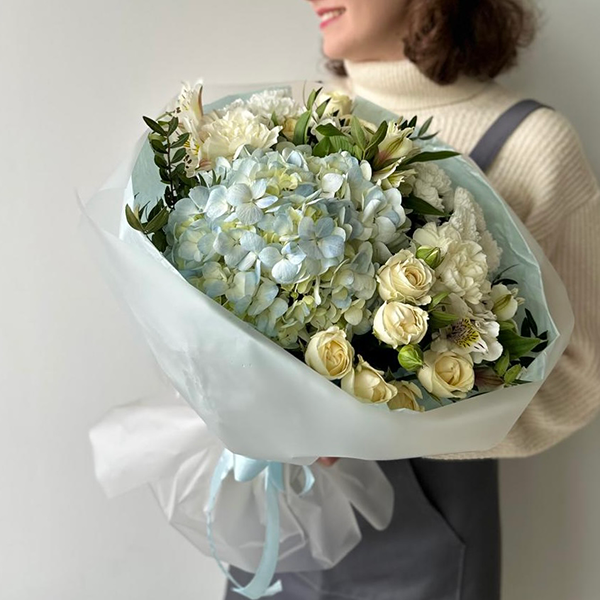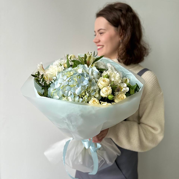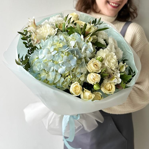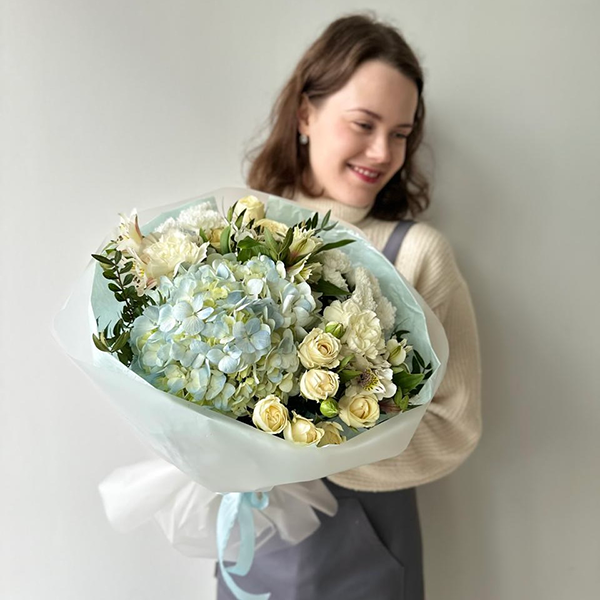 Воздушный голубой букет с гортензией и кустовыми розами "Глори"