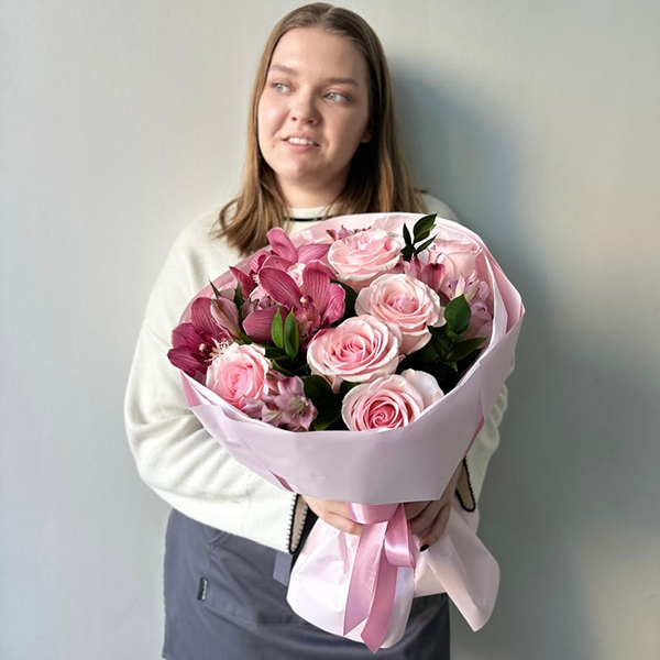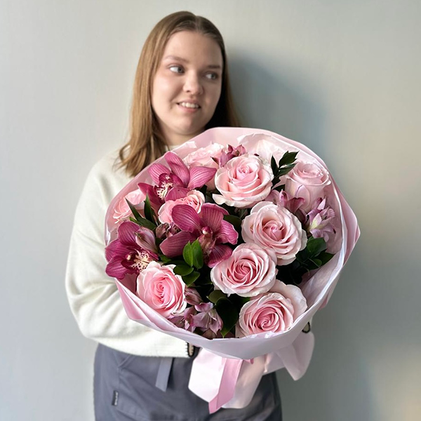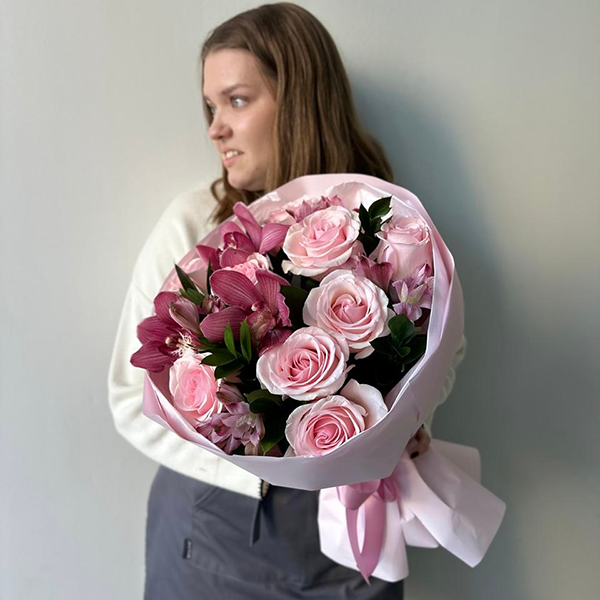 Розовый букет с розами и орхидеями "Мари"