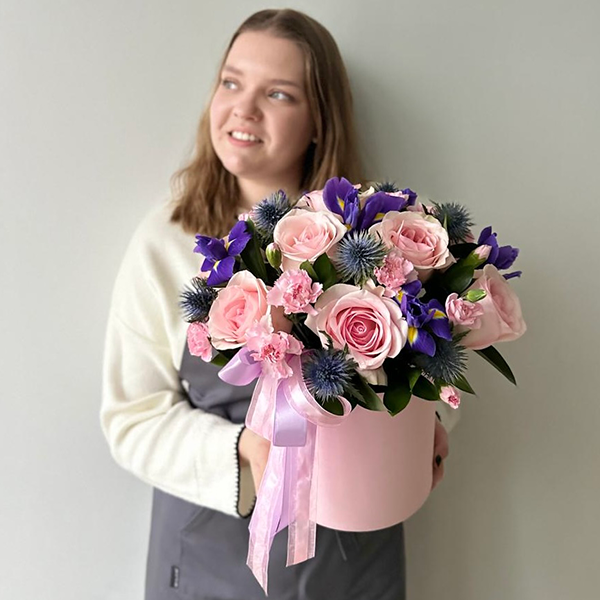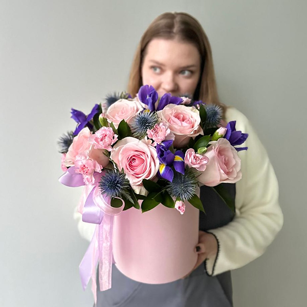 Композиция в шляпной коробке с розами, диантусами и ирисами № 110