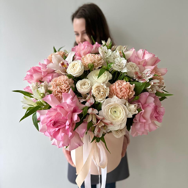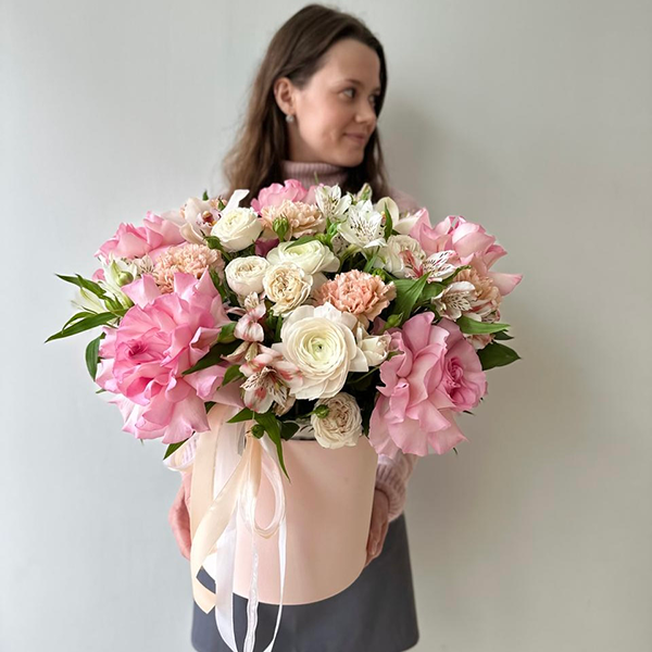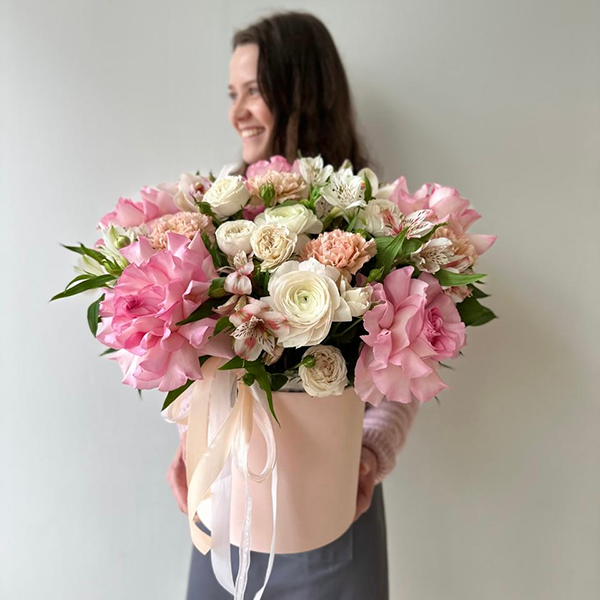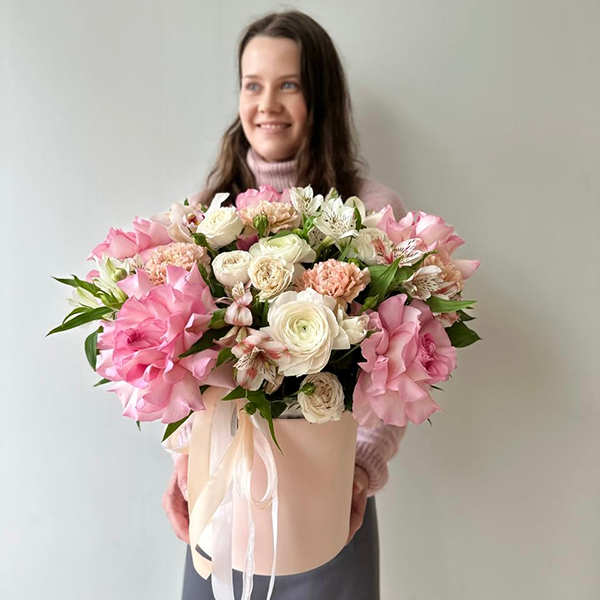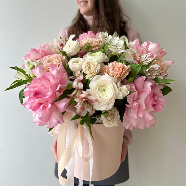 Роскошная композиция в шляпной коробке с пионовидной розой и ранункулюсами № 122
