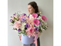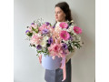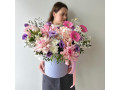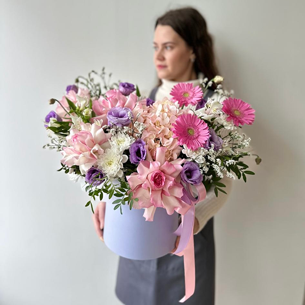 Композиция в шляпной коробке с французскими розами в розово-сиреневой гамме № 80 от 6850