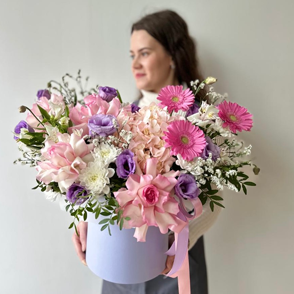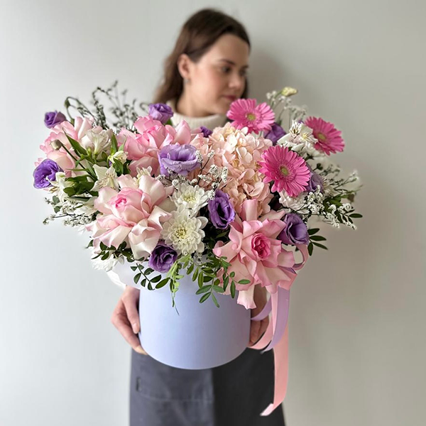Композиция в шляпной коробке с французскими розами в розово-сиреневой гамме № 80
