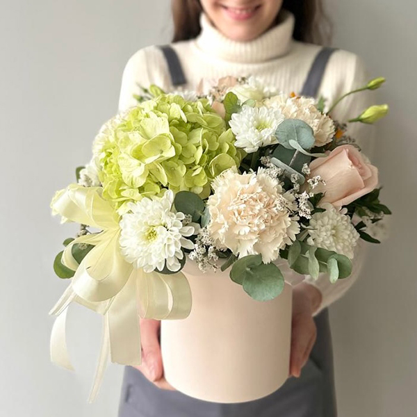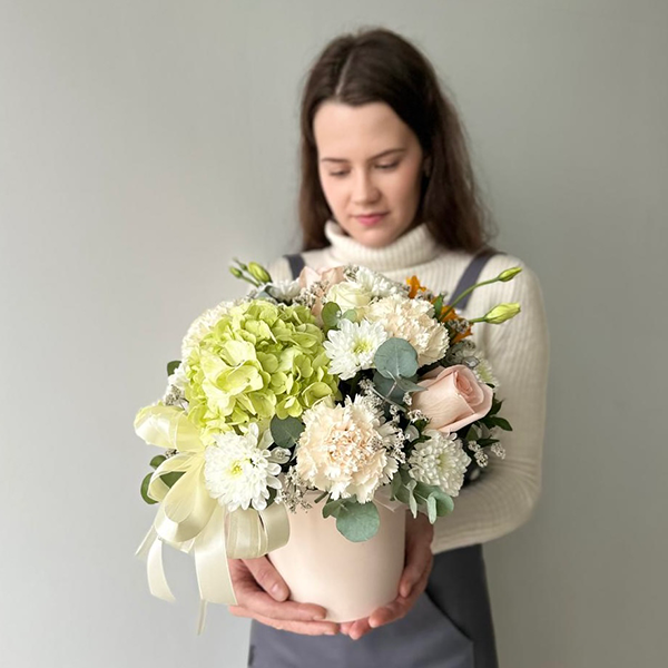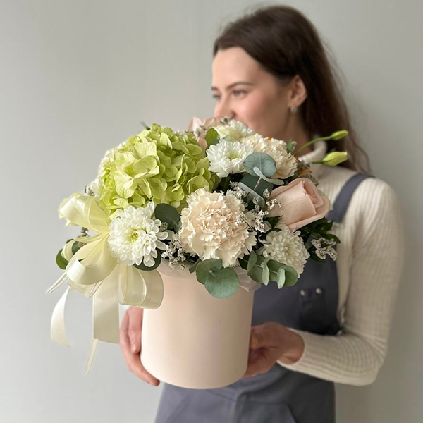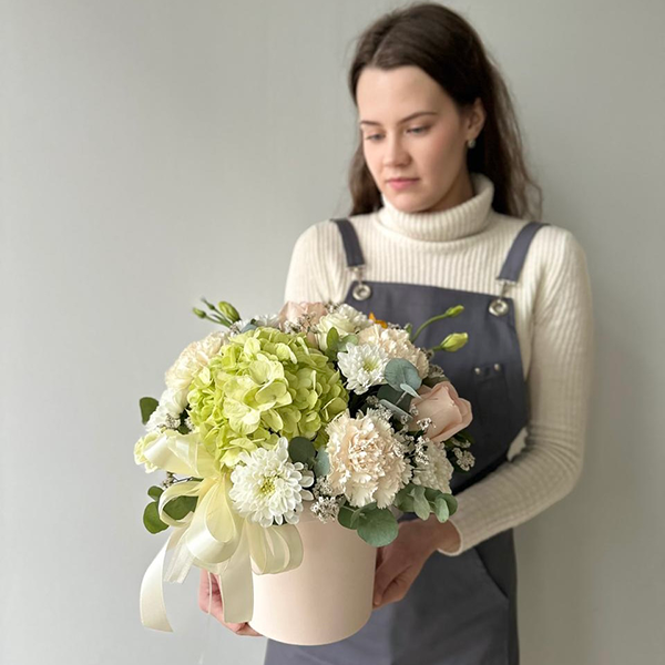 Нежная композиция в шляпной коробке с зеленой гортензией № 125