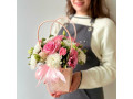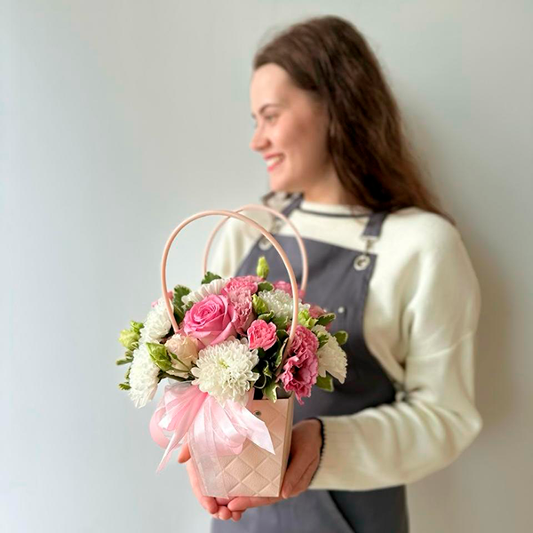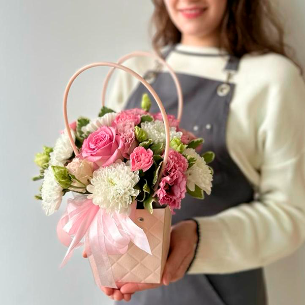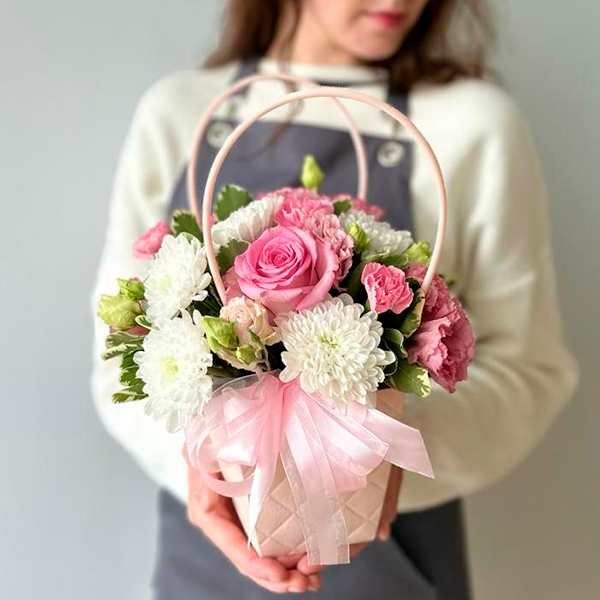 Нежно-розовая композиция в сумочке с розами и хризантемой № 8