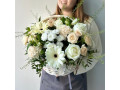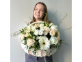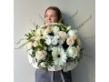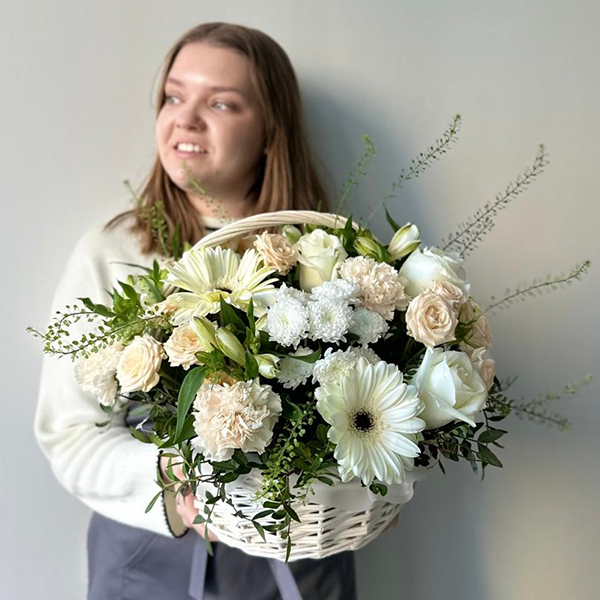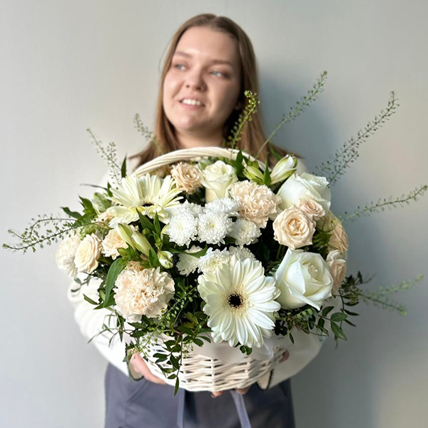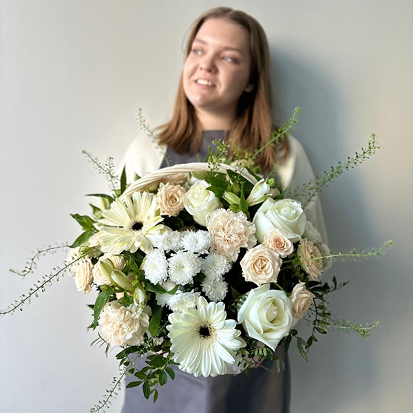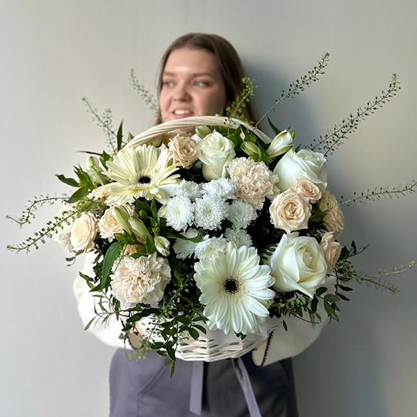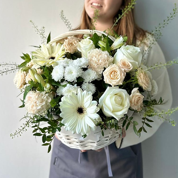 Белая воздушная корзина с герберами, розами и диантусами от 7460