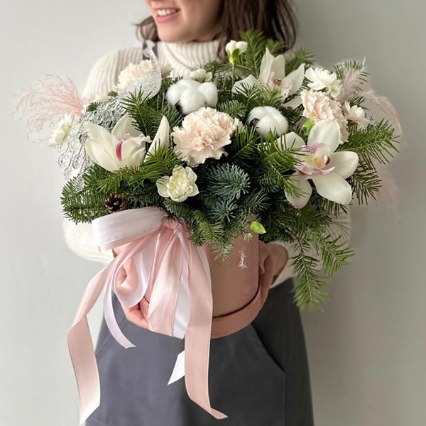Новогодняя композиция в шляпной коробке из живой ели c орхидеей от 3950